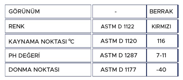 Özellikle alüminyum ve alaşımlarından yapılmış radyatörlü araçlar için formüle edilmiş, özel organik tip korozyon önleyicili, etilen glikol esaslı, kullanıma hazır kırmızı antifrizdir.